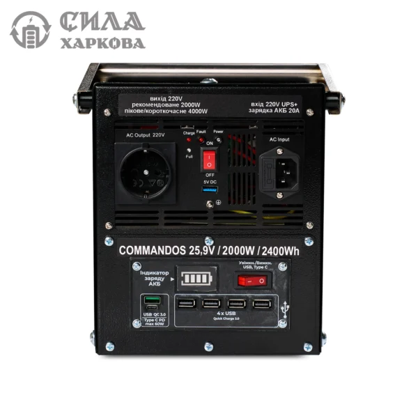 Модель “Commandos 25,9V/2000W/2,4kWh” оснащена потужною акумуляторною батареєю 25,9V ємністю 2,4 kW/h та інвертором потужністю 2000W з вбудованим зарядним пристроєм. Ця комбінація дозволяє забезпечити надійне автономне живлення 220V в будь-якому місці, коли це необхідно. Це особливо важливо в зонах бойових дій! Наші портативні зарядні станції вже допомагають нашим захисникам в зоні проведення бойових дій при використанні системи Starlink (забезпечується автономна робота супутникового інтернету на протязі 18-25 годин), дозволяють військовим заряджати всі необхідні гаджети прямо на полі бою, включаючи рації, тепловізори, батареї дронів, приціли, планшети, телефони та багато інших пристроїв.