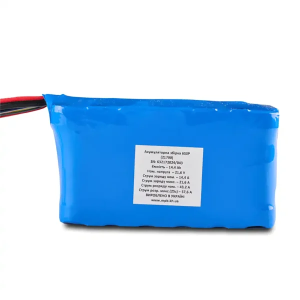 Напруга та ємність: Типова напруга для багатоцільових (6S) літій-іонних акумуляторів становить приблизно 21.6 вольта, а ємність становить 14400 мА·год, максимальний струм розряду – 57,6А.