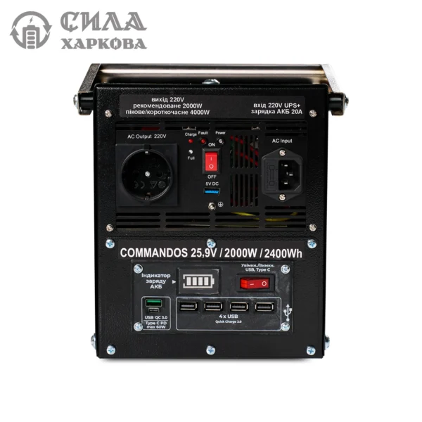 Модель “Commandos 25,9V/2000W/2,4kWh” оснащена потужною акумуляторною батареєю 25,9V ємністю 2,4 kW/h та інвертором потужністю 2000W з вбудованим зарядним пристроєм. Ця комбінація дозволяє забезпечити надійне автономне живлення 220V в будь-якому місці, коли це необхідно. Це особливо важливо в зонах бойових дій! Наші портативні зарядні станції вже допомагають нашим захисникам в зоні проведення бойових дій при використанні системи Starlink (забезпечується автономна робота супутникового інтернету на протязі 18-25 годин), дозволяють військовим заряджати всі необхідні гаджети прямо на полі бою, включаючи рації, тепловізори, батареї дронів, приціли, планшети, телефони та багато інших пристроїв.