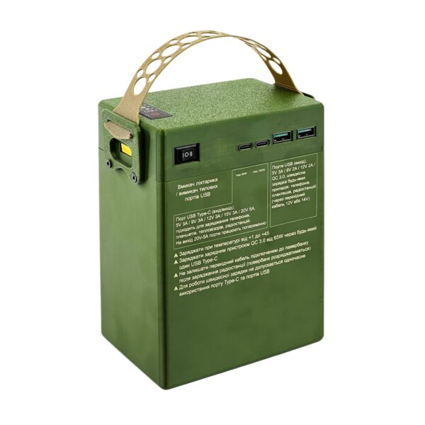 Порт USB Type-C (вхід/вихід) підтримує потужну зарядку до 100W (20V / 5A), що дозволяє працювати не лише зі смартфонами й планшетами, а й з ноутбуками, батареями дронів, тепловізорами, прицілами та іншою спеціалізованою технікою.